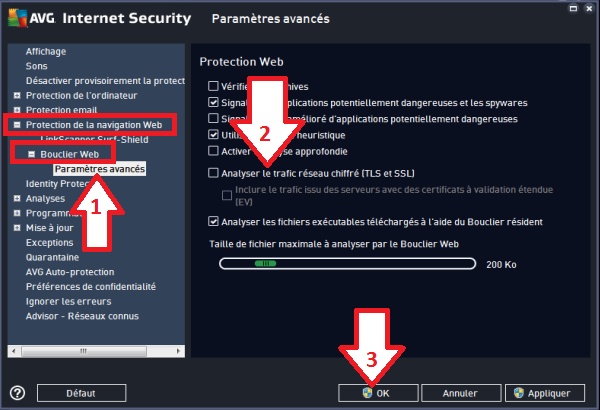 Cliquez sur "Protection de la navigation Web"Cliquez sur "Bouclier Web"Décochez la case "Analyser le trafic réseau chiffré (TLS et SSL)"Cliquez sur "OK"