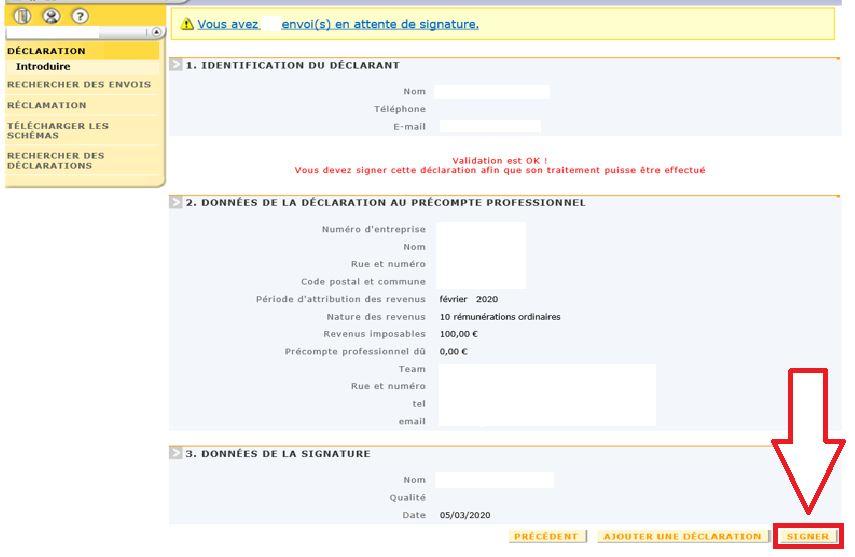 La méthode de signature consiste simplement à confirmer la déclaration et à la signer en cliquant sur le bouton signer